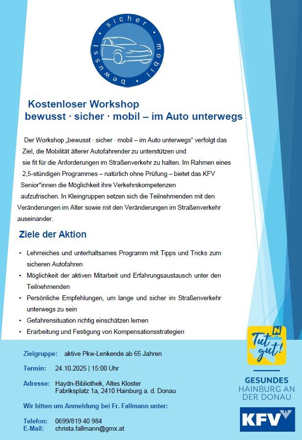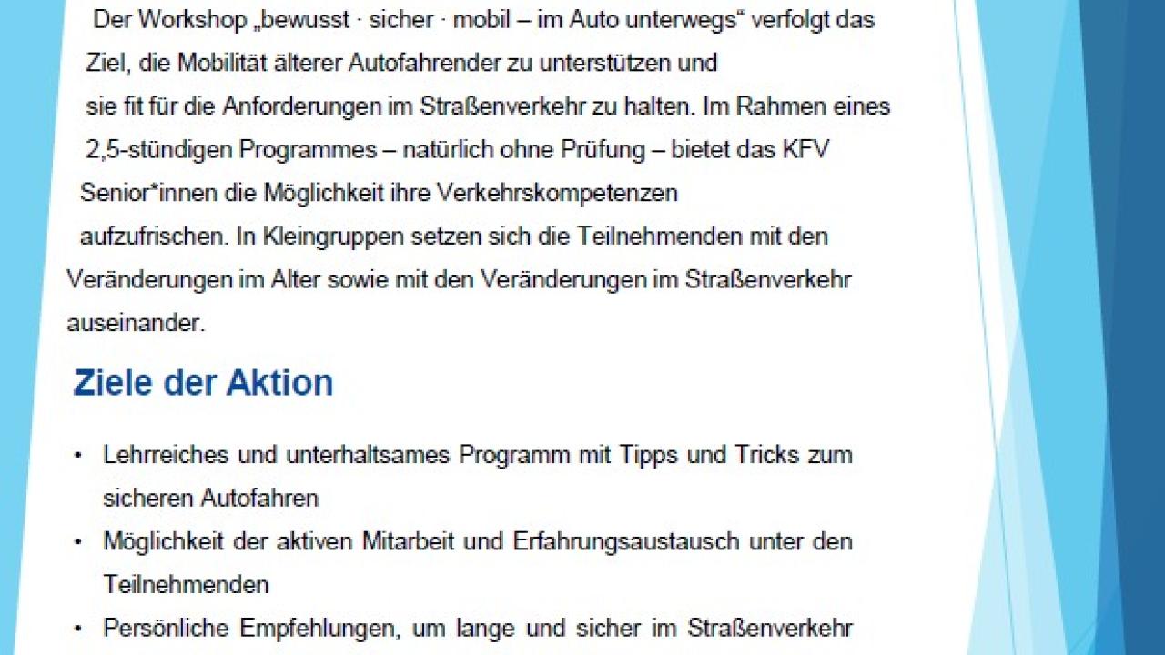 Der Workshop „bewusst ∙ sicher ∙ mobil – im Auto unterwegs“ verfolgt das Ziel, die Mobilität älterer Autofahrender zu unterstützen und sie fit für die Anforderungen im Straßenverkehr zu halten. Im Rahmen eines 2,5-stündigen Programmes – natürlich ohne Prüfung – bietet das KFV Senior*innen die Möglichkeit ihre Verkehrskompetenzen aufzufrischen. In Kleingruppen setzen sich die Teilnehmenden mit den Veränderungen im Alter sowie mit den Veränderungen im Straßenverkehrauseinander.