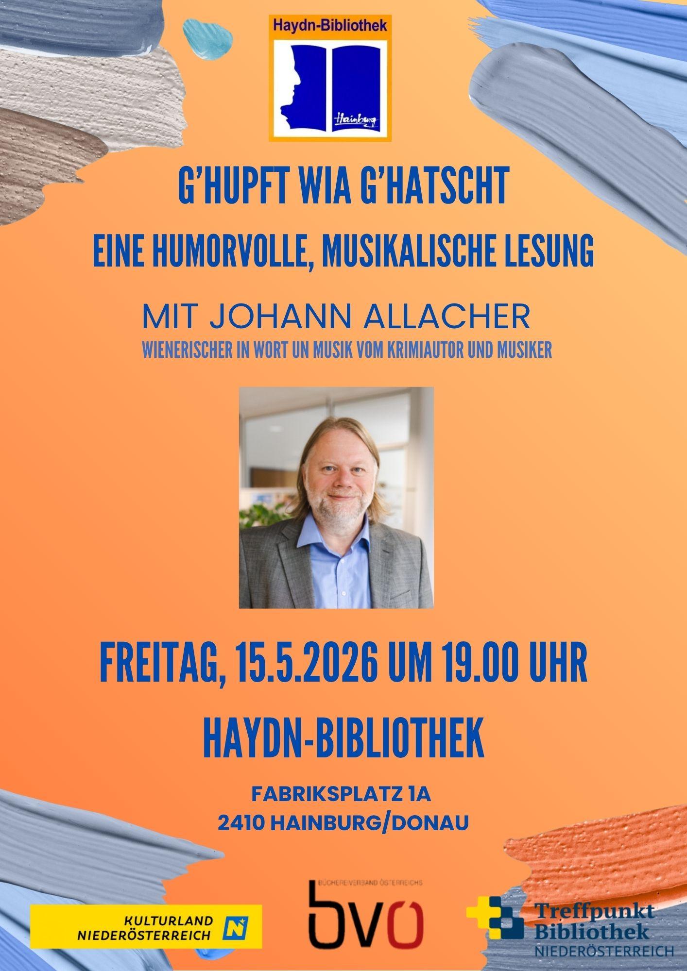 15.05.2026 g'hupft wia g'hatscht - Eine humorvolle, musikalische Lesung mit Johann Allacher Wienerisches in Wort und Musik von Krimiaufor Johann Allacher