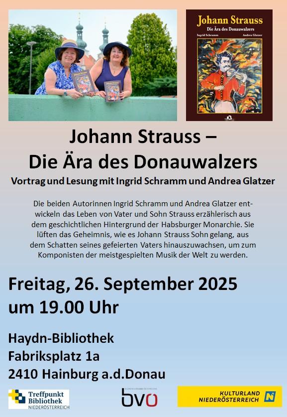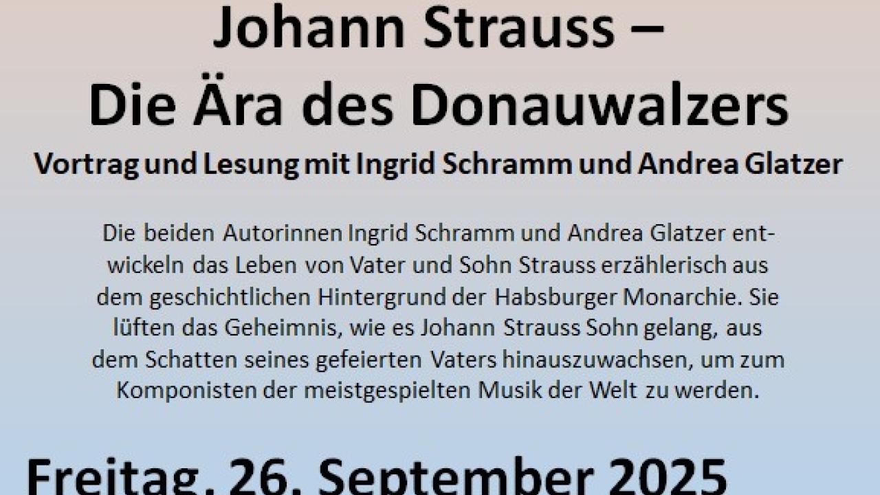 26.09.2025 Johann Strauss - Ära des Donauwalzers Vortrag und Lesung mit Andrea Glatzer und Ingrid Schrammum 19.00 Uhr